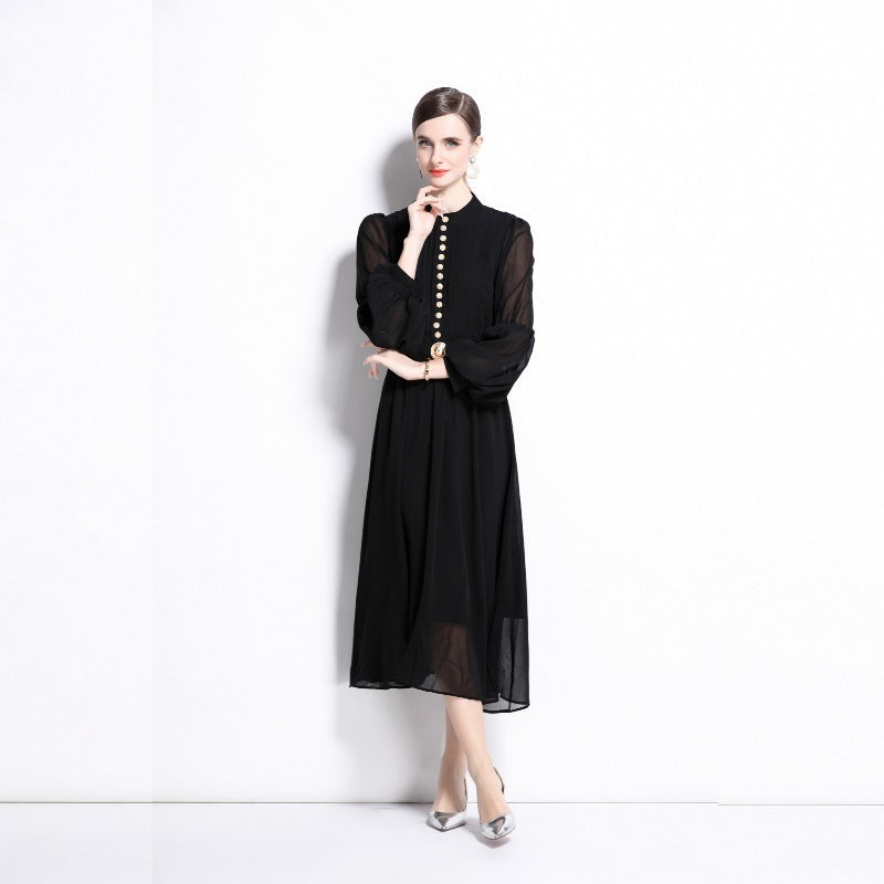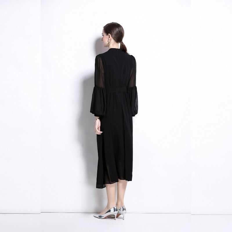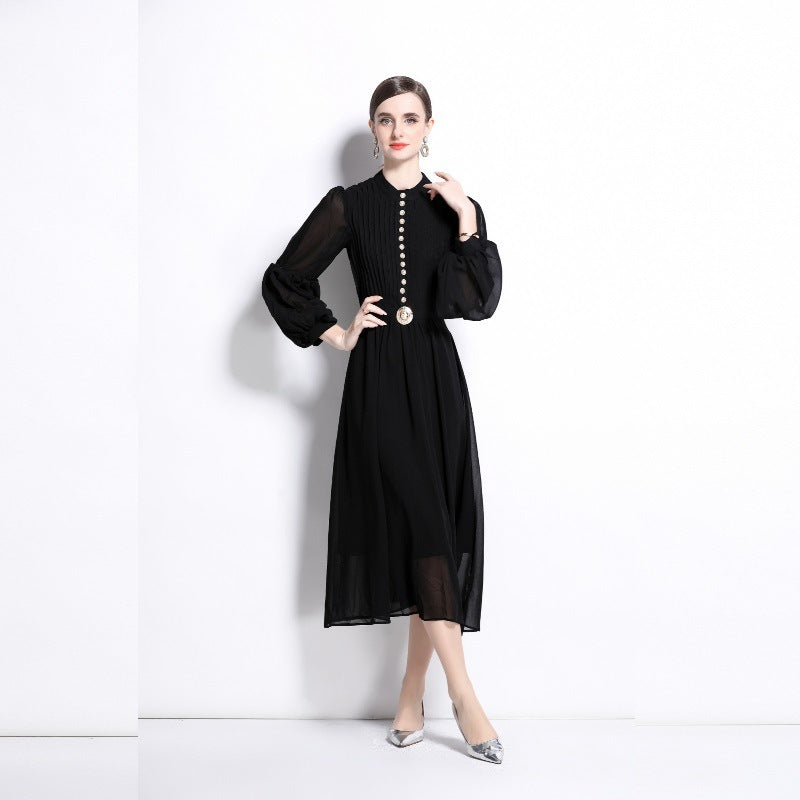 Buckle Pleated Stitching Puff Sleeve Waist-controlled Large Hem Temperament Dress