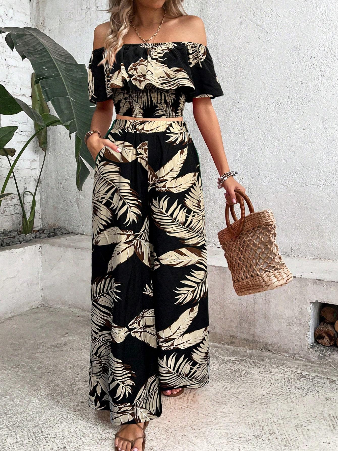 Tropical Off Shoulder Top With Lace Trim And Wide Leg Pants Set