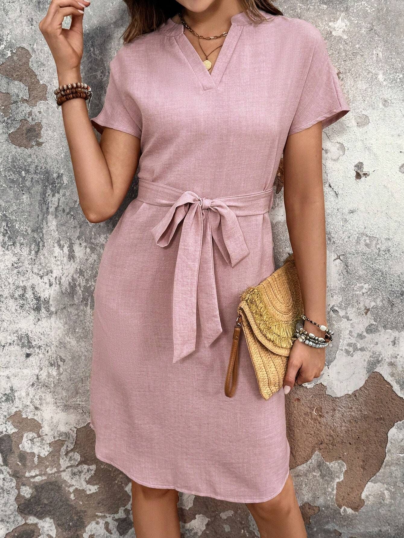 Mid-length V-neck Short Sleeve Bow Belt Dress