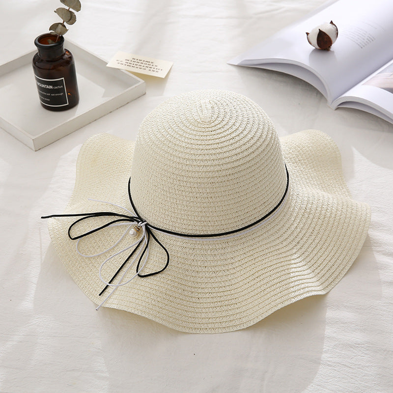 Pearl Bowknot Thin Brim Straw Hat