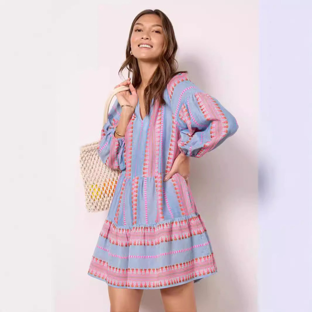 Sleeve V-neck Striped Printed A- Line Skirt Dress