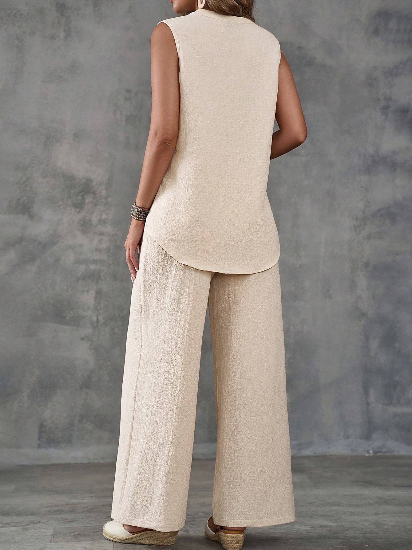 Sleeveless Textured Vest And Wide-Leg Button Front Pants Set